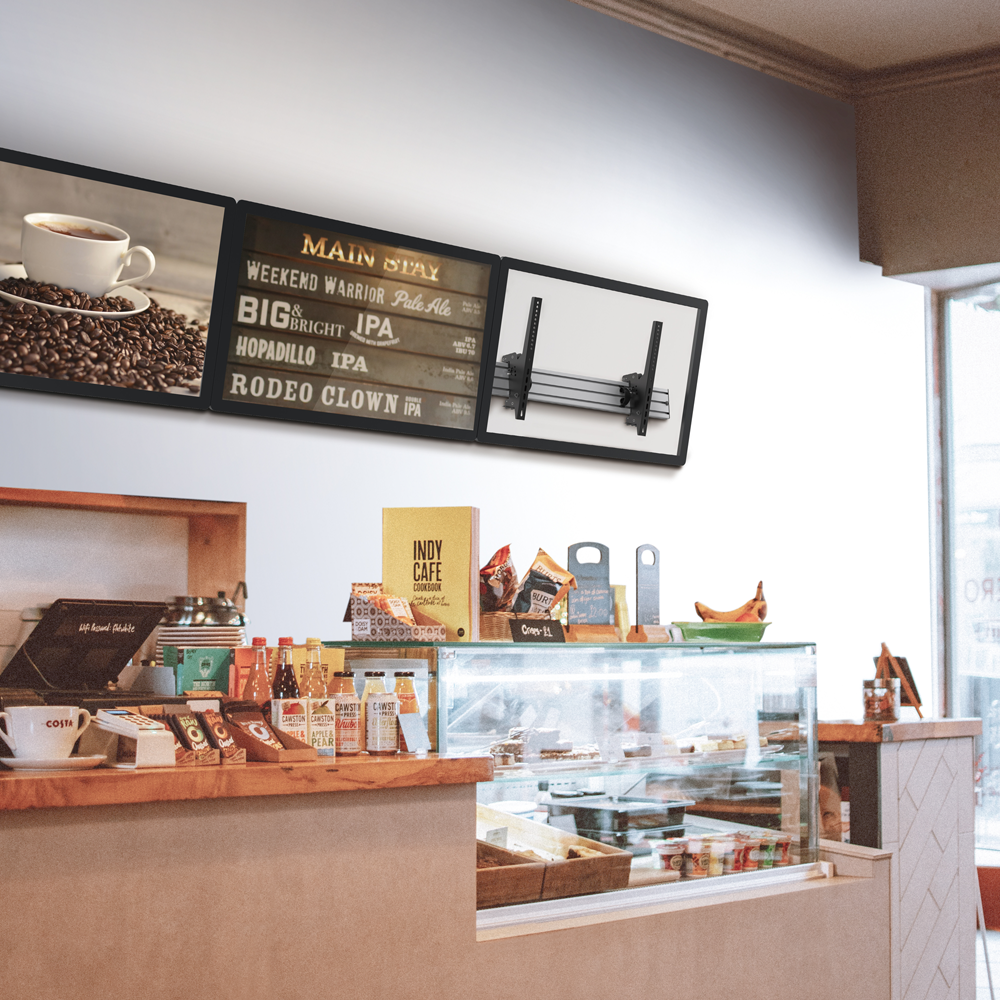 Soporte Menuboard – Peso soportado 50 Kg/monitor – VESA 600×400 mm/monitor – Inclinación 0º ~ -20º – Distancia a la pared 100 mm – Disposición 3×1