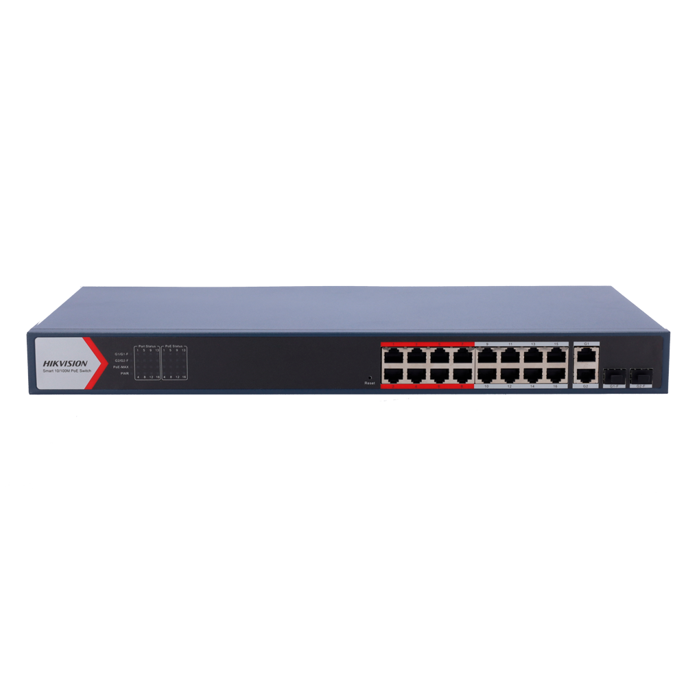 Switch PoE Hikvision – 16 puertos RJ45 FE + 2 puertos Gigabit RJ45/SFP – 16 Puertos PoE+ 802.3af/at – Hasta 230w de Potencia PoE Total – PoE Extendido / PoE Watchdog / Port Isolation – Instalación en rack/pared/sobremesa