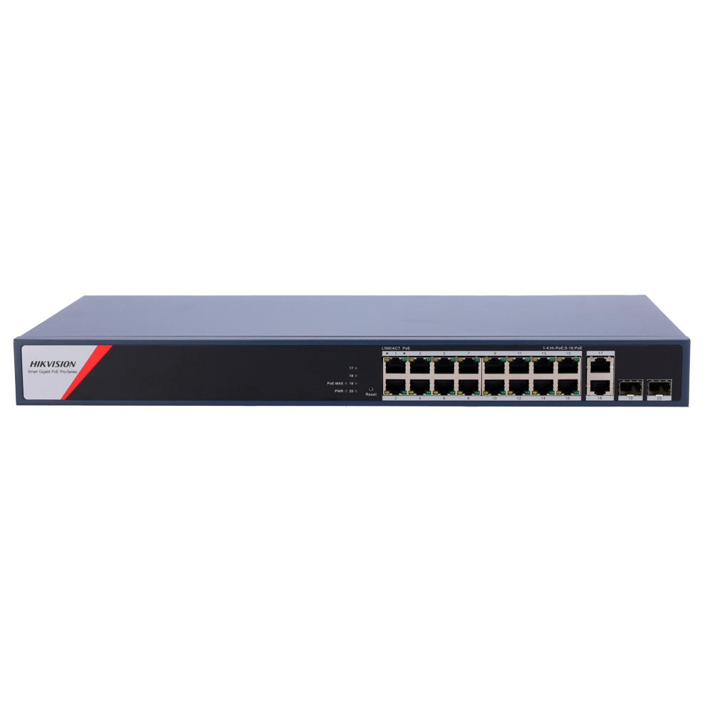 Switch PoE Hikvision – 16 puertos RJ45 GE + 2 puertos Gigabit SFP – 16 Puertos PoE+ 802.3af/at – Hasta 225w de Potencia PoE Total – PoE Extendido / PoE Watchdog / Port Isolation – Instalación en rack/pared/sobremesa