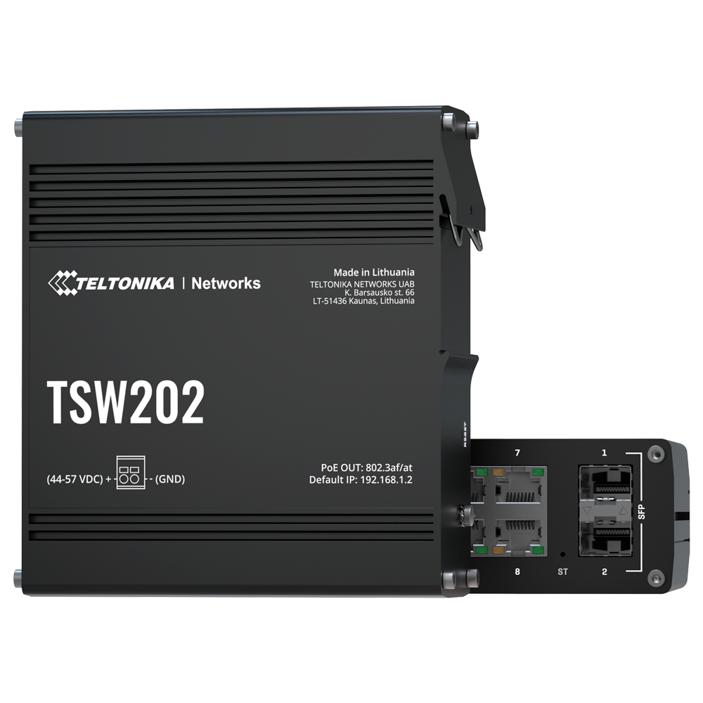 Teltonika Switch PoE Gestionable Industrial – 8 puertos Ethernet RJ45 Gigabit +2 SFP Gigabit – 8 Puertos Ethernet PoE+ 802.3af/at – Hasta 30W por Puerto PoE – Hasta 240W de Potencia PoE – Rugerizado Carcasa Aluminio