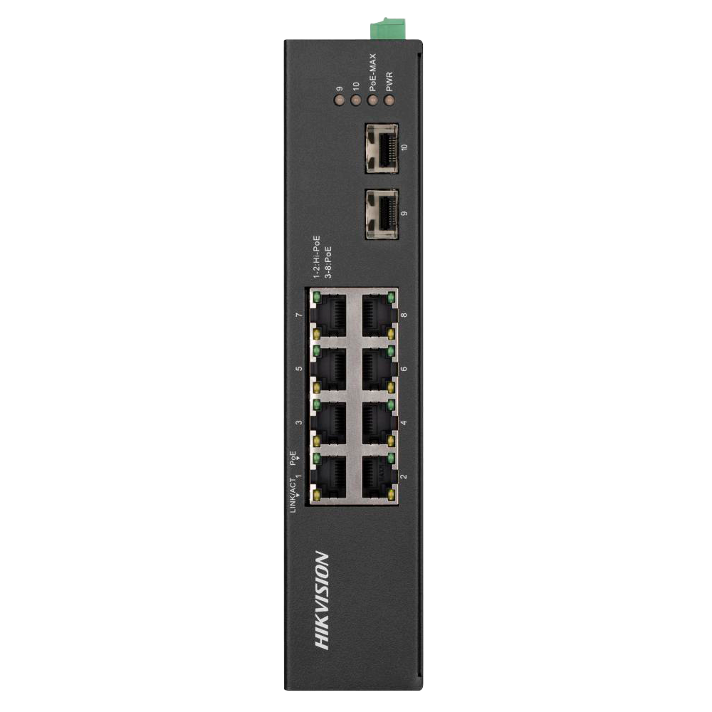 Hikvision Switch PoE No gestionable Industrial – 8 puertos Ethernet RJ45 Gigabit +2 SFP Gigabit – 8 Puertos Ethernet PoE+ 802.3af/at – Hasta 30W por Puerto PoE – Hasta 240W de Potencia PoE – Rugerizado Carcasa Aluminio