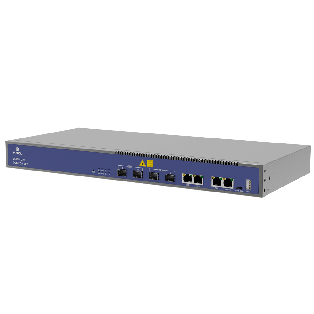 El V1600XG02 es un OLT box de 1U equipado con 2 puertos PON (GPON, XG-PON, XGS-PON opcionales) y 2 puertos ópticos de enlace ascendente 10GE/GE. Con una relación de división máxima de 1:256 (recomendada 1:128) y una velocidad de hasta 10 Gbps, está diseñado para pequeñas empresas, tiendas y arrendamiento de inmuebles, ofreciendo una solución de red de acceso de fibra eficiente y flexible.