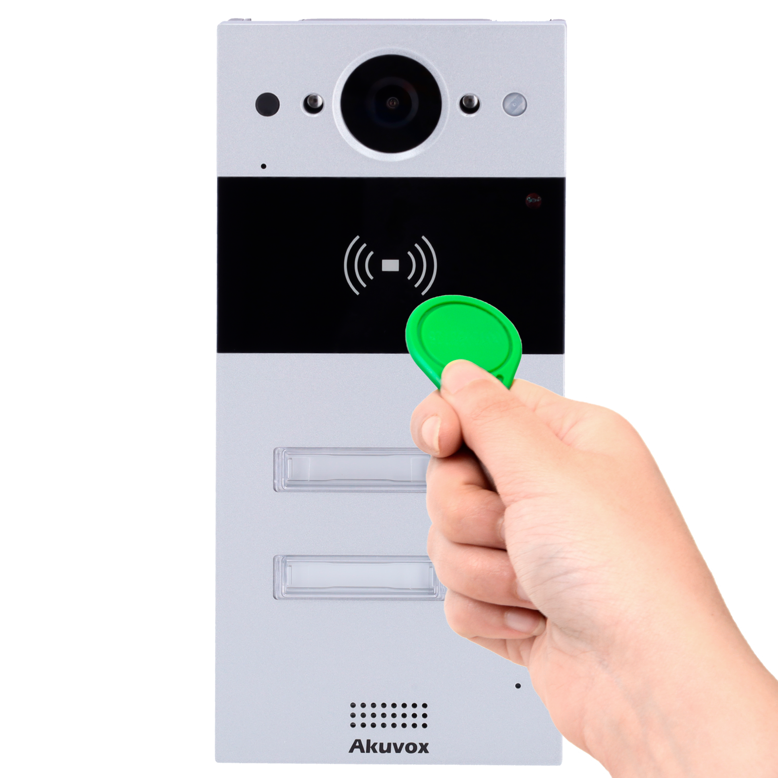 Videoportero IP en superficie – Cámara 2 Mpx | Audio bidireccional – Apertura con tarjeta EM/MF y NFC | 2 relés – 2 apartamentos | PoE, SIP estándar – Mantenimiento Cloud – Conexión de monitor y placas a través de Cloud
