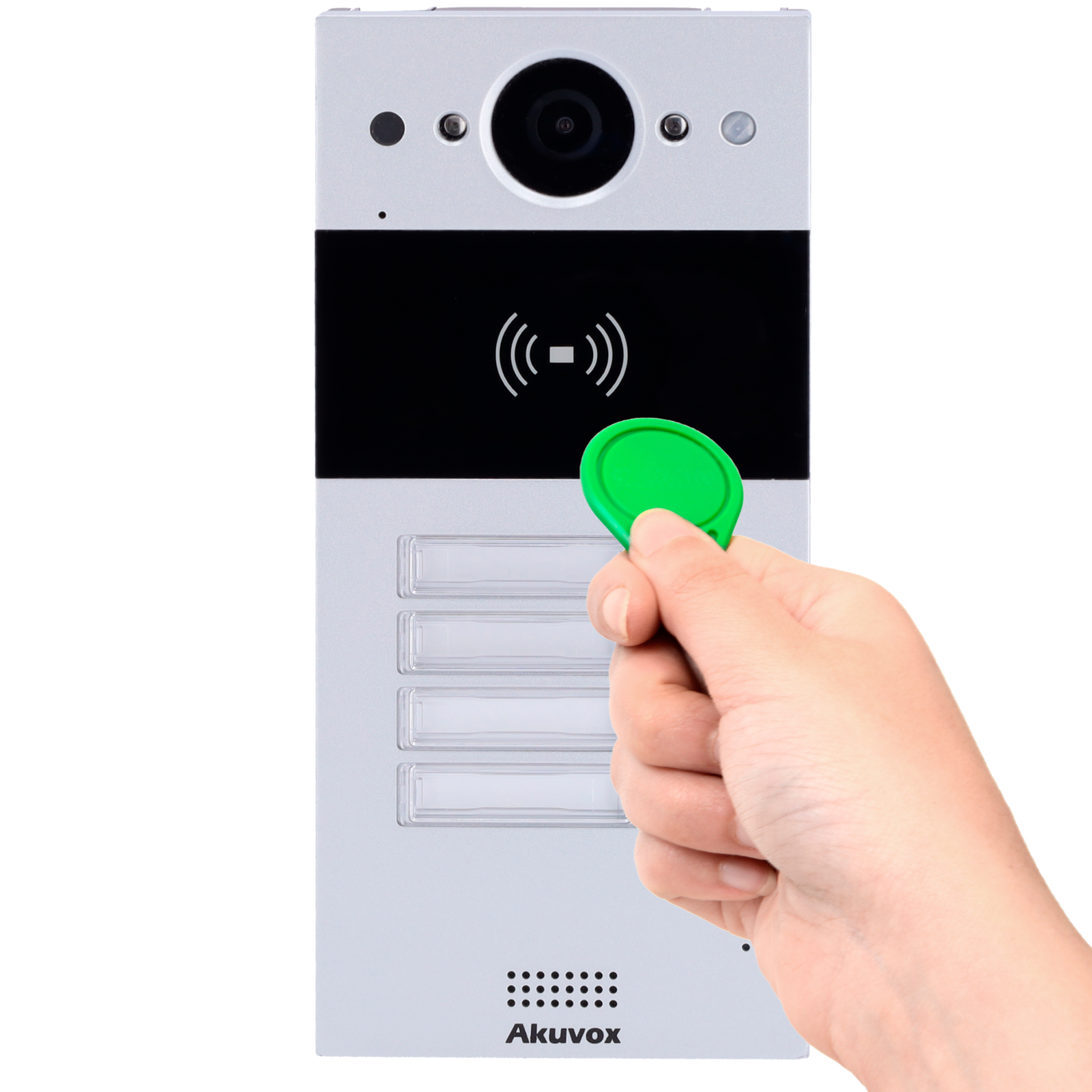 Estos equipos también tienen la capacidad de abrir la puerta mediante sus salidas de relé. Este modelo dispone de 2 salidas de relé para poder gestionar hasta 2 puertas de forma simultánea, con salida de 12 VDC (permite alimentar directamente la cerradura electrónica sin necesidad de una fuente de tensión adicional al alimentarse el equipo por PoE estándar). Además, cuenta con control de acceso integrado, permitiendo la identificación a través de tarjetas o llaveros con tecnología RFID EM de 125 kHz y MF de 13.56 MHz y NFC.
