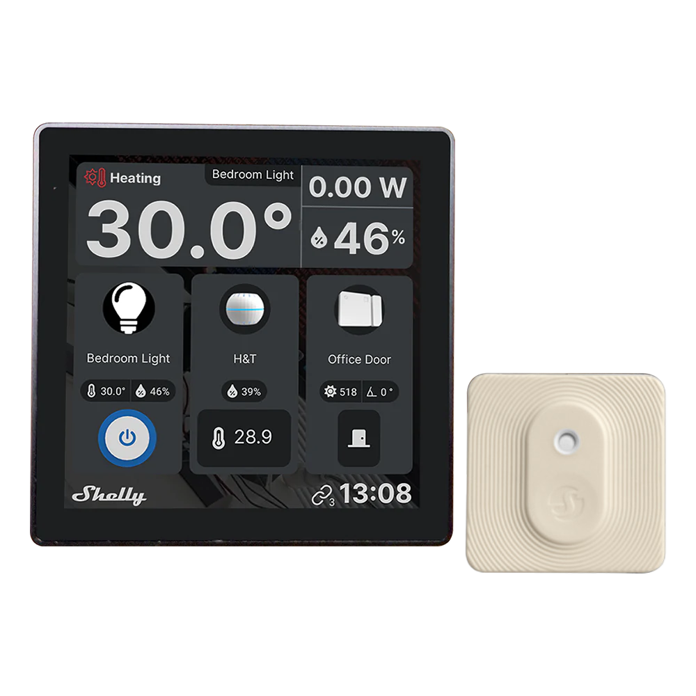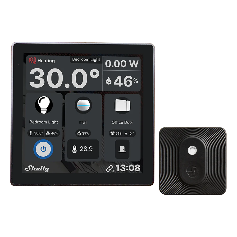 Shelly Wall Display Negro + BLU H&T Negro – WiFi 2.4 GHz / Bluetooth – Sensor H&T – Resistente al agua y al polvo – Batería de hasta 3 años – Compatible con Alexa y Google
